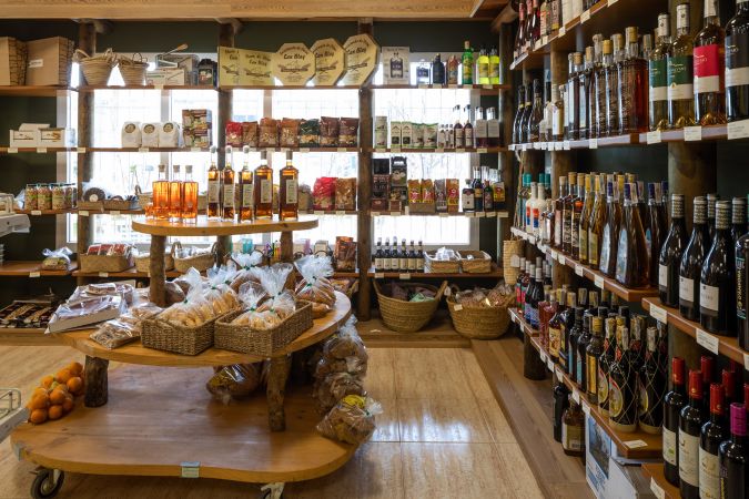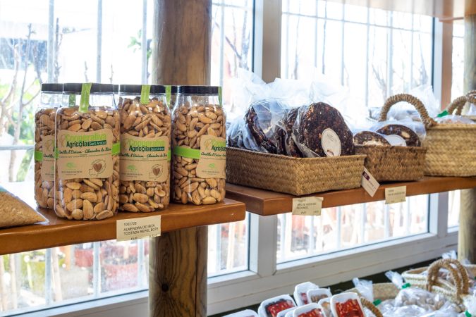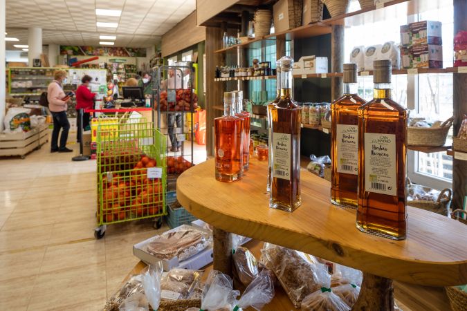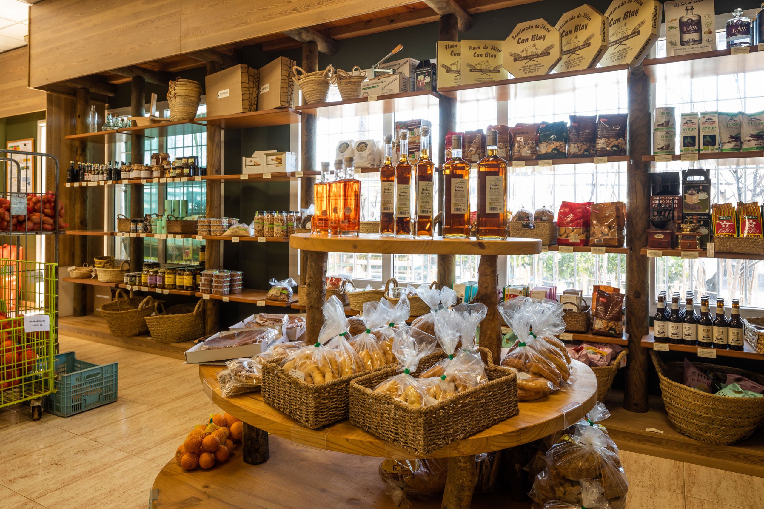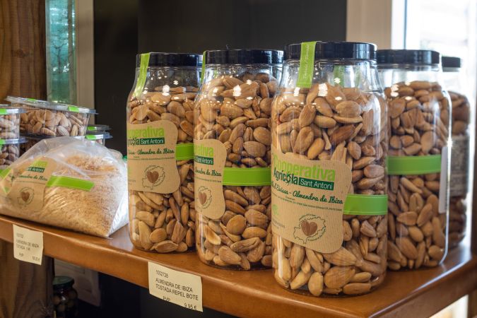 Nuestra pequeña sección de comestibles vende artículos básicos, así como pan payés de Can Blay y flaó y orelletas de Can Rei, además de una oferta de los productos elaborados en la isla (vinos, miel, conservas, licores, aceite, encurtidos, embutidos, frutos secos...) y como no nuestra almendra y harina de algarroba envasada por la Cooperativa.